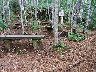 | 山行記 | ●大栗山の帰りに天狗棚へ行こうと思い、面ノ木園地の駐車場に車を停めた。園地では、バイケイソウやヤマオダマキ、ウツボグサ、ノハナショウブなどの花が咲き賑やかだ。 ●園地から天狗棚へ向かう。明るい園地とは対照的な薄暗いブナの樹林帯が続く。途中天狗棚方面へ行く道と天狗棚展望台方面へ行く道が分岐するがとりあえず展望台方面への道を行くことにした。緩やかに登っていく道はトリアシショウマの白い花が目立つ薄暗い樹林帯で、苔むした木の橋などを渡る。 ●稜線に出たところで右に行けば天狗棚展望台へ行くことができるが、この日は晴天だが霞がかかりすっきりとした展望は期待できそうにないので、左の天狗棚山頂方面へ進む。アップダウンのあるブナの稜線道を歩くが、この時季はユキザサのまだ熟していない緑の実が見られるぐらいで、花は見当たらない。 ●山頂かと間違えるようなピークを過ぎ下った所が面ノ木園地への下降点で、天狗棚山頂はそこから数分登ったところにある。樹林に囲まれた薄暗い天狗棚山頂は、標識がなければ山頂とは気付かずに通過してしまいそうだ。 ●山頂からは一旦面ノ木園地への下降点へ戻り、面ノ木園地方面へ下る。やや急な斜面を下りると、先程道を分けた分岐点に出る。その辺りから傾斜も緩くなり、いきなり明るい面ノ木園地に飛び出す。帰りは木地師屋敷跡に寄って帰路についた。 |
