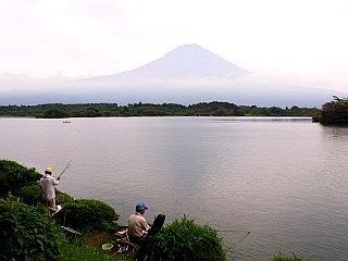 | 田貫湖方面への山道出口 | 休暇村一帯に整備されたデッキと富士山 | 釣り人も多い田貫湖畔と富士山 |