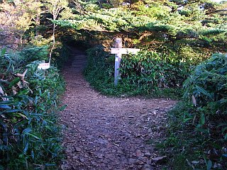 | 登山口手前から見る瓶が森方面の展望 | 登山口 | 国民宿舎からの道との合流点 |
