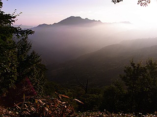 | 山行記 | ●職場のワンゲル部の久々の山行は夜行1泊で四国の百名山2峰を登ろうという強行軍だ。500q以上ある高速道路の運転は何とも思わないが、土小屋までの延々30q続く、車がすれちがえない狭い道の運転にはまいる。幸い深夜なので対向車もなかったが、帰りのことを思うと気が重い。 ●土小屋の駐車場に着いた時は夜明け前で、月と石鎚山のシルエットが綺麗に見えた。少し仮眠をして、夜明けとともに歩き始める。樹林の中を緩やかに登っていくが、絶好の天気で明るい陽が差し込んで気持ちがいい。アキノキリンソウやアキチョウジ、ヤマハッカなど、植物も豊富だ。 ●登山道は急登もなく続くが、高度が稼げないのでいつ急登が現れるのか心配になる程だ。次第に展望が開けてきて木々の間から石鎚山の岩峰が見えるようになる。ベンチが沢山ある休憩地を通過する辺りから植物はさらに豊富になり、ハガクレツリフネやレイジンソウ、オオマルバノテンニンソウなどが群落を形成している。 ●登山道はやや傾斜を増すものの依然高度が上らず、山頂だと思われる岩峰との高度差がリアルに感じられる。やがて、ロープウェイから来る成就コースと出合うが、すぐ上が二の鎖小屋で、ここから二の鎖が始まる。迂回路もあるが、せっかくなので鎖を登ってみることにした。大きな輪状の鎖に足掛け用の三角の鎖が付いていて、足場に困ったときにはこれを利用することができる。 ●鎖場の脇にはリンドウやシラヒゲソウ、ダイモンジソウなどが咲いているが、じっくりと写真を撮っているどころではないので手掛け足掛けの場を探しながら登っていく。白装束の集団も現れ、鎖場と鎖場との合間では法螺貝を吹いていた。二の鎖が終わると一旦普通の登山道になるが、すぐに三の鎖が現れる。 ●これら2か所の鎖場で一気に高度を上げ、三の鎖が終わったところが石鎚山山頂(弥山)だ。山頂には石鎚神社頂上社と頂上小屋があり、広場にはベンチが置いてある。下の方は雲で見えないが、周りの山々が望め気持ちがいい。せっかくなので最高点の天狗岳へも行ってみることにした。 ●一旦下り石の上を辿っていけば、山頂(弥山)からそそり立って見えた天狗岳の山頂に立つことができる。狭い山頂なので360度の展望が広がりいつまで見ていても飽きないほどだが、山頂(弥山)に戻って昼食の時間をとることにした。帰りは鎖場を迂回するコースを通ってみたが、鋼板の桟道から絶壁の足下が見えるのでなかなかスリリングだった。後は来た道を戻るだけだ。 |