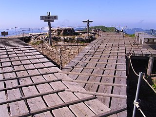 | 山行記 | ●前日宿泊した見ノ越の民宿を出て剣神社の階段下の登山口から登り始める。朝一番からの階段の登りはきつい。剣神社からも昨日の石鎚山とは違って急なジグザグの登りが続く。少し登ると、早朝なのでまだ運航していない登山リフトの下を潜る。その先幾つか分岐があるが全て進路を左に取れば、最短コースで登山リフト終点の西島駅に着く。 ●西島駅には営業していない売店や便所があり、剣山山頂にある雲海荘や三嶺、遠くは昨日登った石鎚山もかろうじて確認することができた。 ●西島駅からは、遊歩道を通って山頂へ行くコースと大剣神社を経て山頂へ行くコースに分かれるが、ここは距離の短い後者のコースへ進む。その先で大剣神社を経るコースと刀掛の松を経るコースと分かれるが、やはり距離の短そうな後者の道を行くことにした。 ●除鹿柵を木の歩道橋で渡り尾根へと登って行く。テンニンソウやシコクブシ、レイジンソウなどが大群落を形成しており見事だ。その先の明るく開けたところが刀掛の松と呼ばれるところで、ここも各方面への分岐となっている。とにかくこの山は、色々な道が整備されていて分岐がやたら多いが、とりあえず往きは最短コースを辿ることにして、標識の距離がより少ない道を選んで進むことにした。 ●刀掛の松からは、ササの中の明るい尾根道で、登り詰めると鳥居があり、それを潜って階段を登ると、剣山本宮宝蔵石神社と頂上ヒュッテの建つ剣山山頂の一角に出るので、その間の木の階段を上り、背の低いササの中に設置された明るい木道を辿れば三角点のある剣山山頂だ。 ●剣山山頂は四国第二の高峰だけあって、360度の大展望が広がる。三嶺を始めとする四国山地の名峰や遠く石鎚山が確認できるが、何といっても隣のジロギュウのササに覆われた美しい山容は秀逸だ。ここからは1時間ほどで行けるらしいが、今日は遥々遠路を帰らなければならないので、また次の機会があればということにした。 ●山頂で至福の時を過ごした後下山にかかる。下山は同じ道を通ってもつまらないので、今度は大剣道を通って大剣神社へ寄っていくことにした。大岩の下に立てられた大剣神社は見るからに霊験あらたかな雰囲気を醸し出していた。お参りをした後は、若返りの水が湧くという御神水を目指して急坂を下った。 ●御神水に着いたがイメージしていたような流水ではなく、溜った水を汲んで飲むもののようで、最初は一同躊躇したが、「若返り」というに言葉には勝てず、結局皆汲んで帰ることになった。 ●御神水からは、再び急坂を下りて遊歩道に出るが、さすがに遊歩道に入ると道も緩やかになる。しばらく歩くと、往きに分かれた分岐に出て西島駅に着く。後は来た道を戻るが、登山リフトはこの時期にもかかわらず多くの人が利用しており、百名山であるということをあらためて実感した。 |