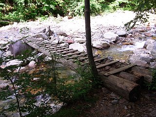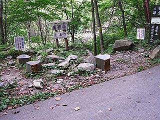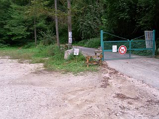 | 登山口手前2kmの地点のゲート | 広河原登山口 | 本谷川を渡る丸太の橋 |