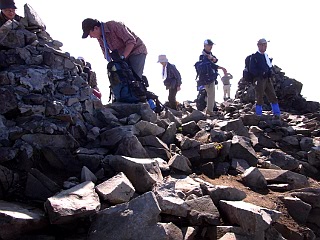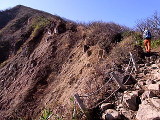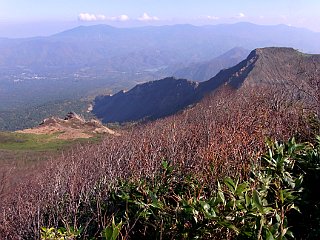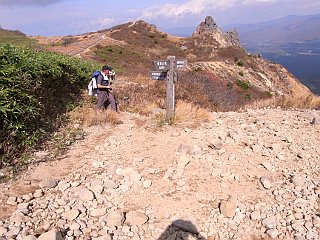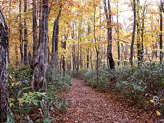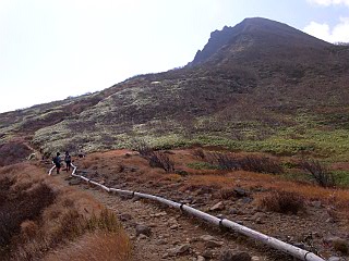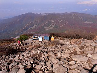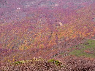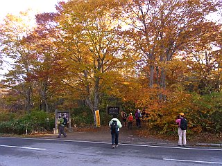 | 山行記 | ●会津2日目は磐梯山を目指す。裏磐梯のペンションに無理を言って朝食を早めてもらい、登山口の八方台駐車場へ向かう。有料道路の磐梯山ゴールドラインは7時前に料金所を通過したので無料だった。 ●八方台駐車場はこの時間で7〜8割方埋まっており、駐車場整理員が配置されていた。駐車場にはバスも何台か停まっており、車外で準備運動や登山の準備をしていたりでとても賑やかだ。 ●こちらも早めに支度をして、バスの団体が動き出す前に出発した。道路を渡り見事なブナ林の中の広い緩やかな登山道を登っていく。降り積もった落ち葉と差し込む日差しの中のブナの紅葉は見事で、とても気持ちがいい。 ●硫黄の匂いがし始め、樹林から突然視界が開けると、中の湯跡に着く。建物は荒れ果て、立ち入り禁止となっているが、露天風呂は今でも入れそうな感じだ。 ●中の湯跡から、横に傾いていて、しかも朝露で濡れていて滑りそうな木道を渡ると、磐梯高原からの道と合流する。さらに、小さな池の畔を過ぎると道は傾斜を増してくる。時折視界が開け、昨日登った吾妻山なども望むことができる。 ●眺めのいい尾根道からトラバースの道に変わると、小さなアップダウンのある狭く歩き難い道となり、ロープの張ってある箇所もある。この日も20人以上が連なるツアーの団体があり、追い抜いたり追い抜かれたりが大変だ。 ●山頂が見え始めるとお花場畑経由で弘法清水へ至るコースと直接弘法清水へ行くコースとの分岐に出る。ここは距離の短い、直接弘法清水へ向かうコースを進む。 ●分岐からは一登りで弘法清水に到着する。ここには2軒の山小屋が営業しており、1軒は開店したばかりで、もう1軒は開店の準備をしていた。 ●弘法清水の山小屋でバッジを購入、弘法清水を一口頂いて山頂を目指す。視界のいい急登が続く。背後には桧原湖や裏磐梯方面、その背後に吾妻連峰がよく見える。 ●急登を登り詰めると磐梯山山頂だ。既に多くの登山者が360度の大展望を楽しんでいる。南には猪苗代湖が一望でき、西には安達太良山、北には吾妻連峰などの山並みが見渡せ、足下には紅葉の絨毯が広がっている。 ●山頂にも山小屋があり、その前に山頂の看板があったので、その前で記念写真を撮って下山を開始する。弘法清水でなめこ汁を頂きながらおにぎりを食べ、少しゆっくりとした。 ●弘法清水からは、今度はお花畑コースを下山することにした。このコースは花の時期にはその名の通り、一面にお花畑が広がるそうで。また機会があればその時季に来てみたいものだ。 ●下山は、登ってくる人が多く、すれ違いに時間がかかってしょうがない。中でも総勢41名のツアーと出合った時には、これではいつ下山できるのだろうと不安になる程だった。 ●下山後は磐梯山ゴールドラインからの見事な紅葉を楽しみ、ゴールドライン出口にある温泉で汗を流した後、長い長い豊川までの道程を急いだ。 |
