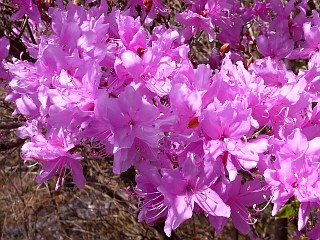 | 山行記 | ●地元の低山では春の花が真っ盛りなので、そろそろ奥三河の山でも花が咲き始めたかと、愛知県最高峰の茶臼山を訪ねた。ついこの間までスキー場で賑わっていたとは思えない程全く雪がない。 ●早速スキー場の第4駐車場に車を停めて歩き始める。見晴らしのいい緩やかな道は「自由の広場」と案内のある所まで続く。広場からは背後の萩太郎山や茶臼山高原がよく見える。 ●自由の広場からは山道に入り、まだ冬枯れの雑木林を進む。まずはコガネネコノメソウがお出迎え。タチツボスミレがあちらこちらで咲いているが、ユキザサはまだ蕾。暖冬といわれながらも、春を迎えて気温の低い日が続いた影響なのか、どうやら今年は花の開花が遅れ気味のようだ。 ●登山道は木の階段などが付けられており緩やかに上っていく。稜線に出ると再び展望が開け、背後の萩太郎山が先程よりも低く見えるが、確実に標高を稼いでいる証拠だ。そこから三角点のある山頂まではあと僅かだ。 ●茶臼山山頂には展望台があり、萩太郎山やその背後に、三ッ瀬明神山や大鈴山、平山明神山、宇連山などの奥三河の山々が一望できる。 ●また、三角点のある広場からもう少し行ったところにも展望台があり、そこからは、蛇峠山や大川入山、恵那山などを見ることができる。空気が澄んでいれば南アルプスも眺められるところだが、この日は晴れてはいるが遠くは霞んで見ることができなかった。帰りは、来た道をゆっくりと花を探しながら戻った。 |
