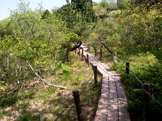 | 山行記 | ●少し早いとは思ったが、キンラン、ギンランを期待して衣笠山を登ることにした。何時ものように藤七原湿地の駐車場に車を停め藤七原湿地を歩く。何時もそうだが「まむし注意」の看板が気になりつつも、すっかりシデコブシも終わった湿原を抜け、「衣笠山40分」の案内に従って山道に入る。 ●その先で舗装道に出るので、少しそれを歩いた後、「戦国燧石取場跡」の案内のある所から再度山道に入る。これも少し上ると未舗装の車道に出る。そこで急に視界が開け、蔵王山や田原の市街や海が見渡せる。明るい道沿いには、コウゾリナやタチツボスミレ、ヒメハギなどが日の光を浴びてにこにこと咲いている。 ●少し車道を歩くと「殿様の狩見張場」という案内が現れるのでそこから三たび山道に入る。山道に入って僅かの所に「家康公の腰掛岩」という大岩があり、その上に立てば田原の市街地や衣笠山の山頂部を見ることができる。その先は、暖地の山らしい常緑樹の多い薄暗い急坂をジグザグに上っていく。暫く上ると里見岩という展望地があり、その先で傾斜が緩くなると間もなく衣笠山の山頂に到着する。 ●山頂には、展望の利く大岩があり、その上には田原山宮奥社が祀られている。今回は少し違う道を歩こうと、反対側の仁崎峠方面へ進むことにした。下り始めると桟敷岩という展望のいい巨岩があり、その上からは、大山や雨乞山などの渥美の山々などを望むことができた。 ●桟敷岩の下には「衣笠奇岩めぐり」という案内があったので、それを一周してみることにした。ビバーグ岩とか亀首岩などの名前が付けられた岩を見ながら一周するコースでなかなか面白かった。 ●奇岩めぐりを終えると、仁崎峠へと向かう。衣笠山から直に下りてくる道と合流すると道幅は広くなる。緩やかで明るく快適な道沿いではオオジシバリやタンポポなどが群落をなし、あちらこちらにウラシマソウの群生が見られた。ウラシマソウ自体最近実物を見たばかりなのに、これだけの群生は見たことがなく、キンランやギンランがなかった代わりの大きな収穫だった。 ●仁崎峠手前で急な階段道と緩やか道に分かれるので、迷わず緩やか道に進む。ウラシマソウの群生は続き、やがて明るい仁崎峠に着く。仁崎峠からは急な階段道を上って帰路に着く。この道は緩やか道よりもはるかに距離が短いようだ。先程歩いた明るく広い道は山頂へ向かう道を分け、そのまま未舗装の車道へつながっているらしく、これなら2度山へ登らずに出発点へ戻ることができる。 ●4回目にしてようやく衣笠山遊歩道の全体像がつかめたので、次回はもう少し違う道を楽しんでみよう、などと考えながら駐車地点である藤七原湿原駐車場へ向かった。 |