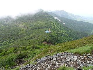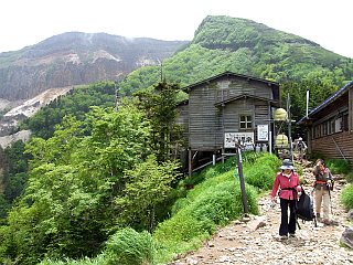 | 夏沢峠には2軒の山小屋が建つ | 夏沢峠から硫黄岳を望む | オーレン小屋 |
