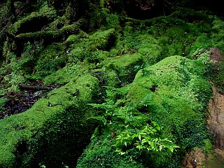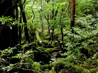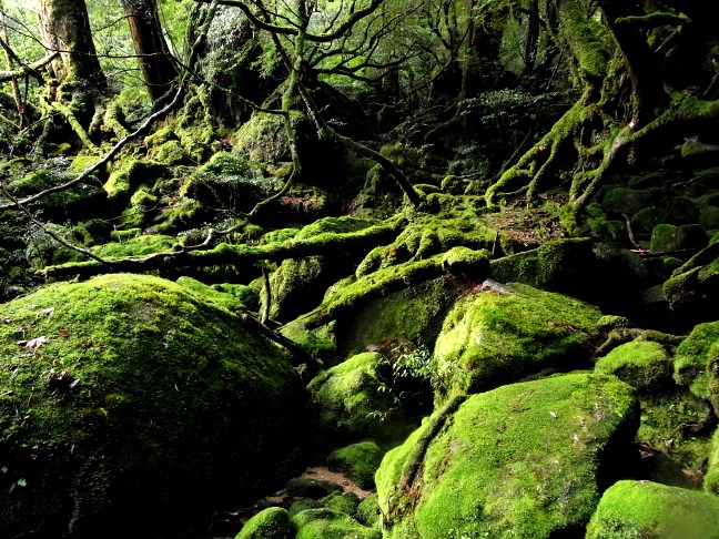 | 奥山を望む太鼓岩と苔蒸すもののけの森 | ||
