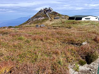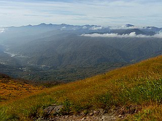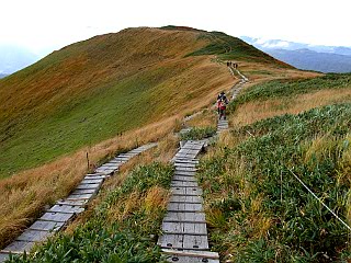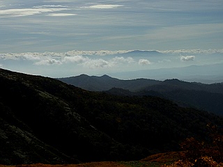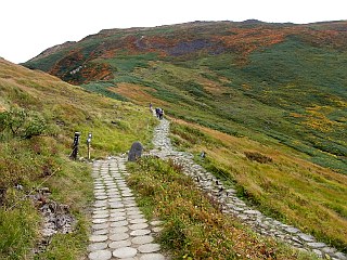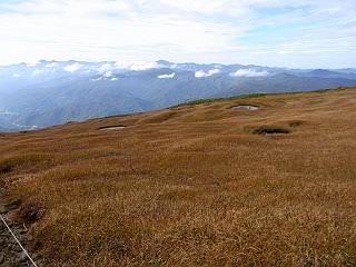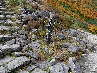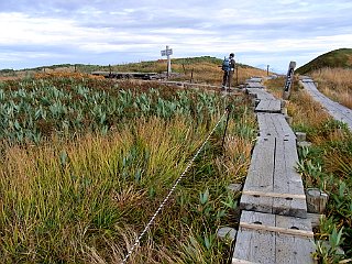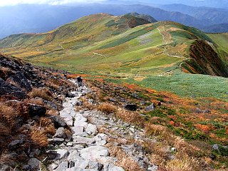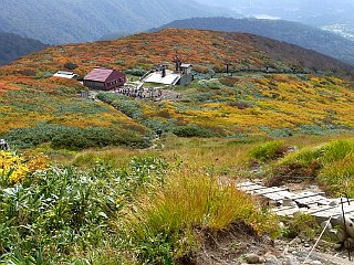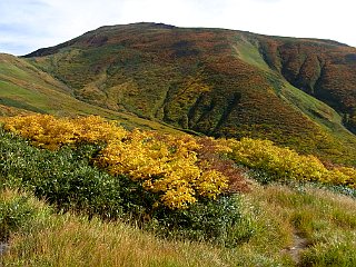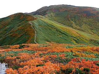 | 山行記 | ●前日の蔵王山に続いてこの日は月山を目指す。この日の登山口である姥沢は、宿泊した休暇村羽黒とは月山を挟んで反対側になるので少し早く出てきたが、カーナビで案内された近道の六十里越街道が途中の橋梁工事で通行止めだったので引き返し、大回りすることになり、その分のタイムロスで、目標としたリフトの運行開始時間には間に合わせることができなかった。 ●ようやく着いた姥沢登山口の広い登山者用駐車場には、清潔で綺麗なトイレも設置されており、既に多くの登山者がリフトの方向へ歩いていた。 ●こちらも身支度を整えると、早速リフト方面へ舗装道路を歩き始めた。姥沢小屋の所で自然保護の協力金(1人200円)を納め、更に進むと、道路の傾斜は次第に急になり、朝一番で慣れていない体には少々きつかった。 ●リフトは姥ヶ岳の中腹まで運んでくれる。リフトを下りて少し歩くと、姥ヶ岳を経て山頂を目指すコースと直接山頂を目指すコースとに分かれるので、まずは姥ヶ岳を目指す。 ●山頂が近付くにつれて風が強くなり、山頂では危険を感じる程の風となった。姥ヶ岳山頂からは、昨日登った蔵王山や吾妻連峰、朝日連峰、鳥海山などを見ることができたが、それどころではない。飯豊山や宮之浦岳、安達太良山でもそうだったが、余程今年は強風に縁があるらしい。 ●強風は、姥ヶ岳から先も吹き続け、木道の上を帽子を押さえながらの歩行となった。月山山頂は最初からよく見えているが、ササが激しく波打つ様子を見ると、この先もまだまだ強風はおさまりそうもなかった。 ●やがて、牛首でリフト上駅から直接月山山頂を目指すコースと合流すると、いよいよ月山の主峰である熊野岳への登りに取り付く。大きい石とザレた小石で歩き難いが、萌えるような紅葉の山肌と青空を見上げながら登れば、いつの間にか山頂手前の広場に着く。 ●広場から見ると、月山の最高所には月山神社が建ち、その左後方には鳥海山が見える。強風は相変わらずで、山頂付近では特に風も冷たく、多くの登山者が神社手前の山荘の影などで風をしのいでいた。 ●下山は、直接リフトへ向かうコースをとる。ここら辺りは風も弱く、緩やかな登山道を紅葉と青空を楽しみながら歩く余裕が出てきたが、稜線を見上げると相変わらずササが激しく波打っており、風の強さに変わりはないようだった。 ●天気予報では、この日は良くて曇り、悪ければ雨という予報だったが、ここまで晴れるとは思っていなかったので、強風は別として、昨日と合わせて2日とも、紅葉と青空と展望を楽しむことができた、いい遠征山行となった。 |