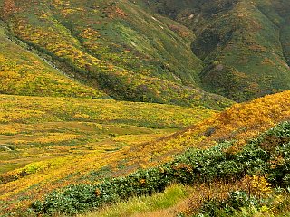 黄色が冴える紅葉の山肌 |