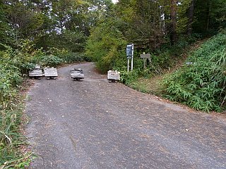 | 樹脂製のベンチが並ぶ喫煙所 | 林道出合 | 七尋岩とチェーンソウアート |