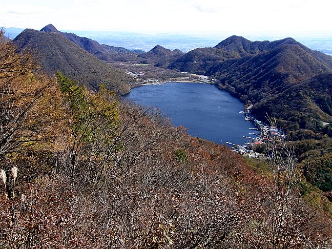 掃部ヶ岳山頂直下の展望所から見た榛名湖とそれをとり囲む山々 |