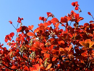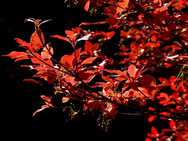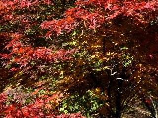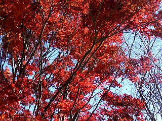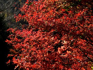 | 山行記 | ●宮路山の名物であるコアブラツツジ(ドウダン)の紅葉が見ごろを迎えているということで、しかも天気もよさそうなので行ってみることにした。宮路山のもみじ祭りが翌日行われるということなので、混雑を避けるためその前日を選んだ。 ●第一駐車場は予想した通り、イベント準備のため使用できなくなっていたので。第二駐車場にとめて歩き始める。駐車場を出るとすぐに山道の案内があるのでそれに従い緩やかな登りを登ると再び舗装道路に出る。それを横断して再び山道を登るとドウダン展望コースとドウダントンネルコースの分岐辺りに出る。 ●朝早くで、まだドウダンの斜面に日が当っていないので、ドウダン展望コースは帰りに通ることにして、ここはドウダントンネルコースを登る。ドウダン自体は既に葉を落としているものが多く、上に行けば行くほど枯木が目立った。しかし、展望は良く、遠くは雪を被った御岳も見ることができた。 ●途中でドウダン展望コースと合流すると稜線は近く、稜線で五井山方面の分岐を左へ向かえば程なく宮路山山頂に到着する。ここからの展望は素晴らしく、御堂山を始め、豊橋市街や湖西連峰、きらきら光る三河湾や渥美半島の山々を一望することができる。 ●この日は五井山まで行く予定なので、早々に宮路山を後にして、稜線を五井山へ向けて歩き始める。最初は植林の暗い稜線道を緩やかにアップダウンしながら歩く、徐々に下る道が登りに転じると宮路山と五井山のほぼ中間点の402.7mのピークに着く。ここには、大きな鉄塔が立っていて、麓からでもよく目立つ。 ●中間点のピークを過ぎると再び下りが多くなる。下りの途中に一か所展望の開ける場所があったが、すっかり草木が伸びてしまい、すっきりとした展望を得ることはできない。その後も緩やかなアップダウンが続くが、名電長沢への分岐点辺りから登りが多くなり、最後は上に白いガードレールの見える急坂を登りきると舗装道路に飛び出す。 ●五井山へはガードレールの切れ目から山道を歩いても、舗装道路を歩いても同じところに出る。山道との合流点からは、舗装道路の数十メートル先からまたまた山道に入る。アオキが群生するやや急な坂を登ると、やがて傾斜も緩くなり大展望の広がる五井山山頂に着く。 ●五井山山頂は、かつてはいい目印だったNTTの鉄塔も撤去されフェンスだけが残っている。ここからの展望もまた素晴らしく、足下に蒲郡市街や三河湾が広がり、その先に渥美半島の山々や三ヶ根山などを見ることができる。北側は、遠く御岳や恵那山まで望むことができた ●暫く展望を楽しんだ後、来た道を戻り再び宮路山に立つ。山頂は紅葉シーズンということもあって、多くの人達でごったがえしていたので、早々に山頂を後にした。今度はドウダン展望コースを下りることにしたが、上部はまだ日が当っておらず、ドウダンの紅葉も今ひとつなので、日のあたっているところまで下りて写真を撮ることにした。ドウダン展望コースの下に展望台があるが、この辺りの紅葉は見頃で、青空を背景にしたり光を透過したドウダンの紅葉がとても美しかった。 |