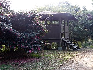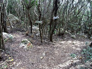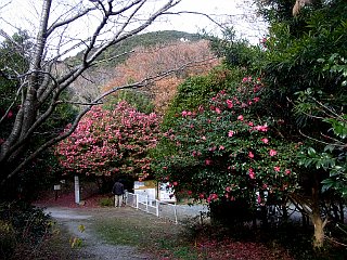 | 桟敷岩新道、ジョギングコース合流点 | ツバキの咲く東屋 | なだらかコース、急な階段コース分岐 |