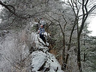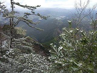 | 山行記 | ●今年の〆の登山として明神山へ行くことになった。天気予報では曇りのち晴れということだったが、登山口へ行く途中で雨が降り始めた。空は青空が見え明るいが、周囲の山は雨模様だ。結局登山口の乳岩の駐車場に着いても降っているのでカッパの上着を着て出発する。 ●しばらくは乳岩峡の渓谷を見ながら緩やかに登る。乳岩分岐を過ぎ少し傾斜が増してくると一服の岩という恰好の休憩場所に着く。雨は既に止んでいて暑いのでカッパを脱いで更に進むが、いつの間にか雪が舞うようになり、鬼岩に着く頃には降り方も強くなってきた。しかし、こんな中でもロッククライミングの練習をしている人がいたのには驚いた。 ●鬼岩からは更に傾斜がきつくなるが、鬼岩乗越まで時間はそれ程かからない。鬼岩乗越からは稜線上を歩くことになり快適な稜線歩きといきたいところだが、大岩を迂回するなどのアップダウンが多く、とてもそんなわけにはいかない。しかも稜線上は既に雪が登山道を覆い、ただでさえ前日の雨で木の根などが滑りやすくなっているところなので歩くスピードは一向に上がらない。 ●胸突八丁の急登も雪で覆われているので滑りやすく、ルートの選択も難しいが、我慢して登りきると六合目に着く。ここは、三ツ瀬登山口からの道との合流点となっている稜線上のピークで、既に標高は912mある。ここも、雪が降り積もり、いつもとは違った雰囲気だ。 ●六合目からは一旦下り、再びアップダウンを繰り返しながら進む。この辺りは痩せた稜線上の道で、岩場が多く、鎖や梯子などが取り付けられているが、雪で滑りやすく慎重に通過しなければならない。 ●やがて明神山の岩場のハイライトである馬ノ背下に着く。雪でここの通過だけが心配だったが、スリル感はあるもののそれほど危険は感じられなかった。むしろ、鉄梯子から馬ノ背に乗り移る部分が雪で滑りやすく少し緊張した。しかしこの辺りから、霧氷が見られ始め、日が当っていないのが残念だが、今シーズン初めて見る霧氷はとても綺麗だった。 ●馬ノ背からは山頂部分を望むことができ、山頂がすぐ近くのように感じるがるが、ここからすんなりと山頂というわけにはいかないのが明神山だ。数度のアップダウンを繰り返し、最後の急坂を登りきって初めて山頂に立つことができる。 ●山頂には鉄製の立派な展望台が設置されているが、この日は山々が雪で見えないだろうと思ったので期待しないで登ってみたが、やはり展望はよくなく、ただ寒いだけなので山頂は早めに切り上げ、山頂から少し下った風のない所で食事をした後、下山を開始した。 |