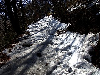 | ダイヤモンドトレイル合流点 | ダイトレに入ると凍った雪が道を覆う | この道を見てアイゼンを履くことにした |