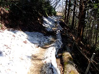 | 山行記 | ●角田山から下山したのが10時頃、これなら弥彦山も登ることができそうだ。弥彦山は、角田山と同じく花が豊富で、今パワースポットとしても脚光を浴びており、加えて東京スカイツリーと同じ高さの山ということで、何かと注目されている山だ。 ●角田浜から約30分で弥彦神社の駐車場に着き、既に参拝客で賑わう神社への道を歩き登山口を目指す。登山口へはいろいろな道があるが、結局は鳥居のある弥彦山登山口へとつながっている。 ●登山口からしばらくは神社らしい大きな杉が立ち並ぶ薄暗い緩やかな坂を登っていく。薄暗い中にも沿道にはエンレイソウやショウジョウバカマが咲き、自然度の高さがよくわかる。 ●やがて道はジグザグに急坂を登るようになる。このコースは合目毎に石柱が立てられているが、10分以上かかる区間から数分で歩ける区間などその間隔はまちまちだ。 ●二合目を過ぎると明るい尾根に出る。タムシバやキブシ、マルバマンサクなどの木の花が目を引く。四合目から急な階段を登ると、鳥居の建つ五合目だ。 ●尾根道から山腹を歩くようになると橋のかかる六合目。この辺りから雪が目立ってくる。休憩所のある七合目を過ぎると道にも雪が残り、雪のない所もぬかるんでいて歩き難い。 ●八合目あたりから時折展望が開け、越後平野や越後三山だろうか、今だ雪で真白な山々が見渡せる。足下には薄紫色や白色のキクザキイチゲが日差しを受けてにこにこと咲いている。 ●最後の急坂をジグザグに登れば、ロープウェイやスカイライン駐車場から来る稜線道と合流する九合目だ。ここは左へ続く緩やかな道を進む。木の板や階段の上を歩く道だが、数十センチの雪が残っている所もあり、そこでは雪の上を歩くかぬかるみを歩くかの二者択一だ。 ●やがて弥彦神社御神廟のある弥彦山山頂に到着すると大勢の登山者がお参りの順番で列を作っていた。山頂からは日本海の海岸線や越後平野、霞んでいるが雪を被った越後の山々を見ることができた。 ●弥彦神社御神廟でお参りを済ませると一旦九合目まで戻る。時間も早いことだし三宝山へも寄ってみようと行きかけたが、カメラの電池がピンチになってきたのでそのまま下山することにした。 |