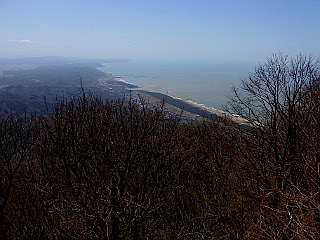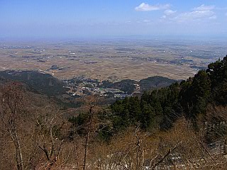 | 九合目からも雪の残るぬかるんだ道が続く | 山頂から見る越後平野 | 山頂から見る海岸線 |