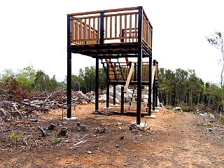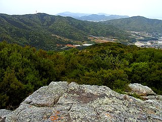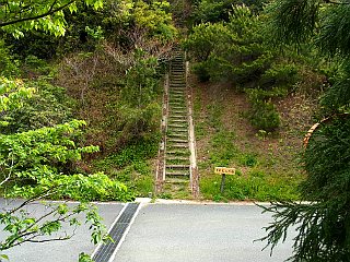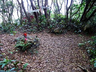 | 仁崎峠の急な階段コース入口 | 桟敷岩新道、ジョギングコース合流点 | 桟敷岩と渥美半島の山々 |