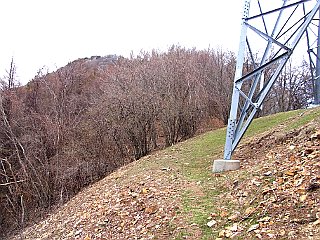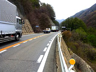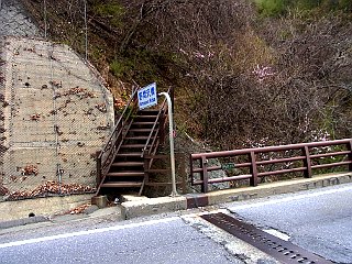 | 大型トラックなどが行きかう狭い路肩を歩く | 野間沢橋左詰め登山口 | 鉄塔標識 |