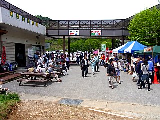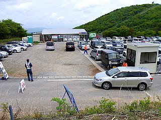 | 平日にもかかわらず賑わう茶臼山高原 | 満車状態の第四駐車場 | 第四駐車場脇の茶臼山登山口 |