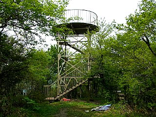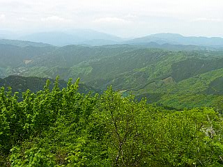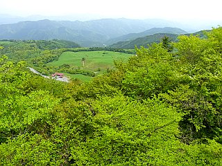 | 茶臼山山頂長野県側の鉄製の展望台 | 鉄製の展望台から見た大川入山と蛇峠山 | 新緑の茶臼山高原 |