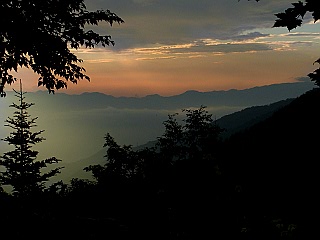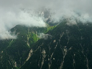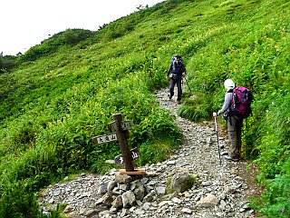 | 山行記 | ●ここのところ日本百名山登山中心で北アルプスは御無沙汰していたが、急に高山の雰囲気が味わいたくなって出かけてみることにした。行き先は、どこでもよかったのだが、手軽に日帰りできる蝶ヶ岳にした。この山を訪れるのは、30年前に大滝山から餓鬼岳まで縦走して以来で、ここで販売されているという美しい山バッジも気になっていた。 ●平日とはいえ、大手の会社はお盆休みに入っているところもあり、三俣の駐車場には既に多くの車が停まっていた。夜がしらじら明けてくるのを待って歩き始める。 ●ゲートから未舗装の林道を少し歩くと、トイレと小屋のある登山口に着く。ここで登山届を書いて出発だ。ここから山道になり、5分も行けば常念岳方面との分岐になる。ここは沢沿いに蝶ヶ岳方面へ進むが、沢が増水しているときは常念岳方面から迂回することになっているらしい。 ●10分程歩くと、迂回路からの道と合流し吊橋を渡る。さらに流れを数回渡り進んでいくと力水という水場に出る。豊富に湧出する水は冷たくておいしい。 ●水場を過ぎるといよいよ急坂が始まる。ようやく明るくなり始め、朝焼けの山並が美しく、花も、ソバナやヨツバヒヨドリ、キオンなど、地元の山では見られないものが多くて楽しい。 ●更に急になる斜面に付けられたジグザグの道をひたすら登る。ゴゼンタチバナやマイヅルソウの実、コイチヨウランやツルリンドウなどの花が咲いている。登るに従い無数に咲くカニコウモリの花が目立つようになる。 ●急坂が一段落すると「まめうち平」というピークに出る。地図では行程の半分以上の位置になっているが、実際はもっと手前のピークらしく、三俣から2.5km、蝶ヶ岳まで3.9kmの地点だ。 ●まめうち平から緩く下り、しばらくは平坦な道を進むが、ぬかるみが多く歩き難い。右手前方には常念岳が見え始め、まだまだ標高差があることを実感する。 ●蝶ヶ岳まで2.5km地点である蝶沢を渡ると再び急坂が始まる。ジグザグの急な登りは、木の根や岩で登り難い箇所が多く時間がかかるが、より近くに見える常念岳の雄姿や道端の花を励みにひたすら登るしかない。 ●旧ベンチ、最終ベンチとぐんぐん標高を上げ、花も、ウサギギクやハクサンフウロ、クルマユリなどの高山帯の草地に咲くものが現れ始める。 ●やがて大滝山への分岐が現れるが、この辺りはこのコース随一の花畑になっている。ウラジロタデやヨツバシオガマ、キヌガサソウ、クルマユリ、ハクサンフウロなどが咲き乱れ、日本アルプスの醍醐味の一つを存分堪能することができた。 ●あとは、花畑の中をもうひと登りで蝶ヶ岳山頂に到着する。期待した槍・穂高連峰のパノラマが、生憎の厚い雲で上部を見ることができなかったのは残念だが、下界では猛暑が続く中、高山の涼風を楽しむことができた。 ●それでも雲が取れないかと、蝶ヶ岳ヒュッテ前のベンチでしばらく待ってみたが、いっこうに晴れそうもないので諦め、バッチを購入して下山を始めることにした。この前後の日は晴れて槍・穂高の展望が良かったということを聞くと、やはり、日本アルプスは日帰りではもったいない。できれば泊りで来たいものだということをあらためて感じた。 |