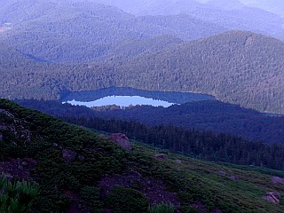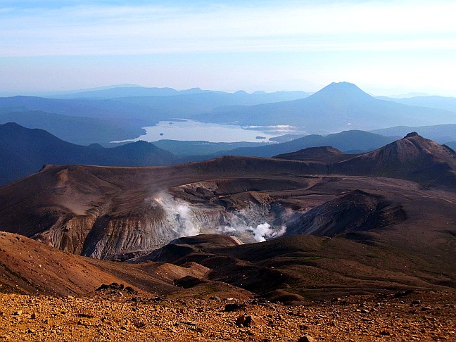 ![]() 雌阿寒岳山頂から見た雄阿寒岳と阿寒湖 |
