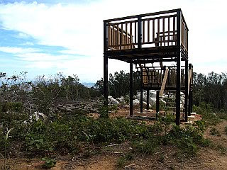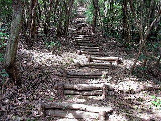 | 松尾岩コースの木の階段 | 殿様新道との合流点 | 展望台のある衣笠山山頂 |