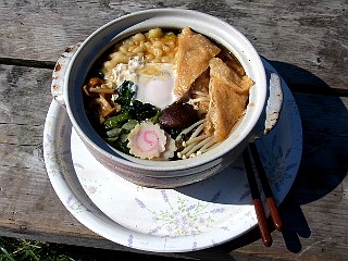 | 鍋割山荘名物鍋焼きうどんは具だくさん | 稜線から塔ノ岳を見る | 小丸直下の二股分岐 |
