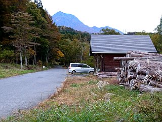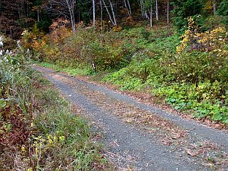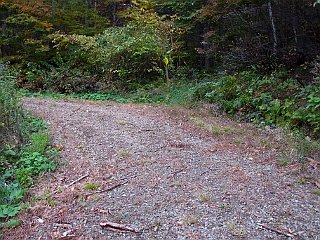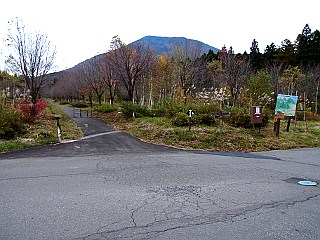 | 町民の森登山口と黒姫山 | 登山口の休憩舎と妙高山 | 何度も林道を横切る |