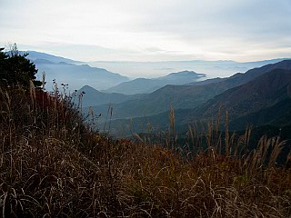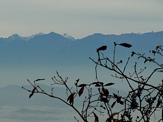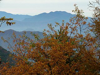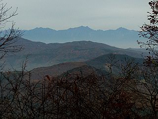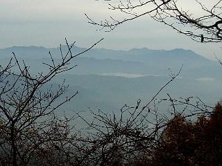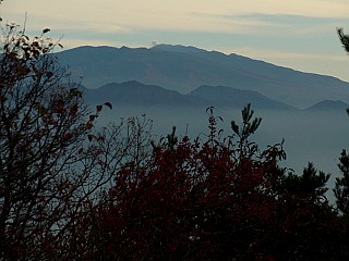 | 山行記 | ●長野県中部にある冠着山は、別名姨捨山といい、姨捨伝説が残る山だ。今回は、新そばを目的に妻と信州へ行くので、ついでに軽い山へ登ろうということで、この山を登ることにした。 ●登山口の鳥居平には広い駐車場と立派な案内板がある。案内によると、頂上まで1,100m、25分とある。少し軽すぎたようだが、ここまで来てしまったのでここから出発することにする。 ●最初は緩やかに林道を登る。この辺りの紅葉はいい色だ。登山口から10分程歩くと林道は終点となり、山道が始まる。よく整備された歩きやすい道を登ると、5分程で稜線の鞍部に到着する。 ●稜線鞍部から稜線を登ると、葉を落とした樹木の間から高妻山や黒姫山などの北信五岳を望むことができる。さらに登ると、西側が開けた展望地があり、北アルプスの峰々へと眺望が広がる。 ●そこからは、あと一登りで冠着山(姨捨山)の山頂だ。山頂は小広く、ほぼ360度の展望が広がる。北アルプスは、槍・穂高から白馬まで、北信五岳や浅間山、美ヶ原などの山々や千曲川と善光寺平など、展望には事欠かない。 ●いつまで居ても飽きないが、いつまで居ても仕方がないので下山することにした。帰りは、紅葉を楽しみながらゆっくりと下る。手軽なコースだからなのか、帰りに何組かのグループと出合った。 |