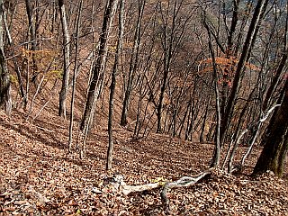 | 山行記 | ●大西山は、南アルプスの前衛、伊奈山脈の1峰で、手頃な登山が楽しめる山だ。以前、伊奈山脈の最高峰である鬼面山に登ったとき、紅葉が美しかったので、この山もそうだろうと思い訪れてみた。 ●駐車場は、現在休業中のつり天国の駐車場を利用する。休業中だが有料のようなので、料金300円を料金箱に入れ出発する。登山口は舗装道を歩いてすぐのところにある。 ●案内に従いビニールハウスの横を通って樹林帯に入る。大きなジグザグをきって続く道だが、曲がり角毎に案内があり迷うことはない。 ●このジグザグ道は、これから延々と続く。残念なことに、台風の影響からか、木々の葉があまり残っていないため紅葉もいま一つで、ミズナラなどの落ち葉が多く、道が確認できないのと滑るのとで歩きにくい箇所もある。 ●岩場の休憩場所を過ぎると傾斜は更に増すが、緩やかにジグザグがきってあるのでそれ程大変ではないが、不安定な箇所もあるので慎重に歩く。 ●やがて左にトラバースするようになると、ミズナラとカラマツが交互に現れ、足元に低いササが見られるようになると、間もなく稜線の唐松峠に着く。 ●唐松峠から一登りで三角点のある、ガイドブックでは前大西と紹介されているピークに飛び出す。展望のないこのピークを後にして更に進むと、今度は開けたピークに出る。塩見岳は雲がかかって見えなかったが、荒川三山は望むことができた。 ●ここまで来れば大西山山頂まではあと僅か。三角点はあるが、展望もないし、大きな山頂の標柱が立っているわけでもなく、そこが山頂なのかどうかを疑う程地味な山頂だ。山頂で腹ごしらえをした後、下山は来た道を戻った。 |