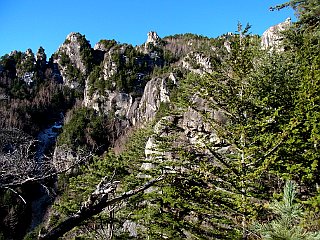 | ようやく林道に出る | ロッククライミングをする人 | 青空と岩峰とシラカバが美しい |