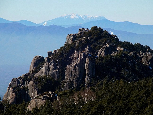 岩上から見る瑞牆山と御岳(瑞牆山山頂に立つ登山者も見える) |