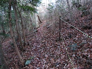 | 陣座峠の黒松峠登山口 | 採石場の周りに張られたトラロープ | 送電線鉄塔 |