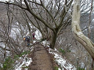 | 山行記 | ●日曜日には全国的に晴れるという予報だったが、この地域だけ雪雲が覆い、前日からの雪混じりの雨が止まない。ホテルのロビーで恨めしげに空を眺めるが、一向に止む気配がない。午後は晴れるということなので、時間を遅らせて出発。しかし、登山口の角田浜が近付いても小雨が止まないので、酒屋へ寄って酒を買いながら時間を潰す。その時間がいい間合いだったのか、角田浜に着く頃には雨も止み、青空も見えてきた。 ●角田浜には、既に多くの登山者が押しかけており、大型バスも数台停まっていた。こちらも早速支度をして出発する。今回も登りは桜尾根コース。頻繁に車が往来する舗装道路を歩き、登山口から登り始める。 ●桜尾根コースはいきなりの急登だ。登るに従い背後の海岸線が見る見る下に見えてくる。しばらく登ると、お目当てのオオミスミソウが現れ始める。雨の直後なのであまり開いているものはないが、時季的には一番いい頃のようで、濃い紫や白、ピンクの株をあちらこちらで見ることができる。中にはよく開いているものもあるが、雪のためなのか傷んでいるものが多い。 ●急な道も一旦落ち着き、何度かアップダウンしながらの平坦な道に変わる。しだいに登山道脇の雪が多くなり、融けた雪でぬかるみになっているので、長靴だが跳ねを上げそうで歩き難い。登るに従いカタクリやキクザキイチゲも見られるようになるが、やはり、よく開いているものは少ない。 ●山頂が近付くと痩せた尾根を登るようになるが。雪解けの水が泥流になって流れている状態で、下りの登山者とすれ違いで待っているのはいいが、跳ねをかけられそうで気が気でない。やがて灯台や五ヶ浜方面から来る木道と合流すれば、あと少しで角田山山頂だ。 ●三角点も確認できない程雪が多く残る広い角田山山頂には多くの登山客が休憩しており、この時間にも次々と新しいパーティーが到着して賑やかだ。こちらも雪の上で軽く休憩をした後下山を始める。 ●下山もいつものとおりの灯台コースを下りる。やはり登山道はぬかるんで歩きにくい。途中で五ヶ浜や浦浜へ下るコースを分けると一段と雪と泥の急な道となり、跳ねを上げないよう慎重に下るが、段差の大きいところは大変だ。しばらく下ると緩やかな道になる。ぬかるみもそれ程ひどくなく、斜面に咲くカタクリの群生が見事だ。 ●緩やかな道もそれほどは続かず、幾つかのピークを越えて角田岬灯台まで一気に高度を下げる、途中の岩場は展望がよく、青い空と碧い日本海、佐渡島などの展望が素晴らしい。角田岬灯台からは、急な階段を下りて角田浜に下り、車を置いた駐車場まで歩いて戻った。 |