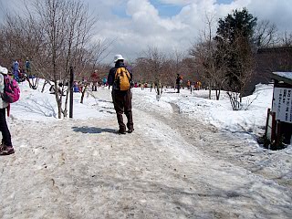 | 灯台方面からの木道と合流する | 雪が多く残る角田山山頂 | 灯台へ続く道は団体の登山者の列が続く |