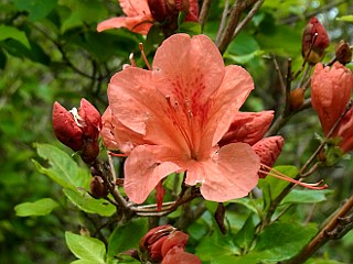 | 山行記 | ●当初、金草岳へ行く予定だったが、冠山林道がまだ開通していないということなので、前日になって急遽この山に差し替えた。出発当日になっていろいろと資料を集めてとにかく出発する。当初予定していた冠山峠までだと4時間以上かかるが、ここは約2時間半で登山口のこいの森の駐車場に着くことができた。 ●駐車場からは、舗装道を少し登れば野坂岳の登山口だ。いきなりカラー舗装された急な坂が現れがっかりするが、最初でもあり、ペースを保ちながらゆっくりと登る。沿道ではタツナミソウやコアジサイ、コナスビなどがいい感じで咲いている。 ●道はいつの間にか舗装が切れ、沢沿いを歩くようになる。タニウツギやヤブデマリが谷を埋め尽くし、足下にはニョイスミレやミゾホウズキ、コナスビなどが咲き競っている。やがて水場のあるトチノキ地蔵に着くが、ここも、カマツカやクルマムグラ、フタバアオイなど、花でいっぱいだ。 ●水場で美味しい水を飲んで先に進む。ここからしばらくはジグザグの急登が続くが、タニウツギの薄いピンクとやヤブデマリの純白の花で覆われた谷の向こうに敦賀の街と若狭湾が見渡せる光景は、まさに絶景だ。 ●谷筋から尾根道に入ってもしばらく続く我慢の急登を登りきると、一の岳に着く。ここは展望がよくベンチが設けられており、金色に輝く観音様が祀られている。 ●一の岳から少し下り、再び登り返す。樹木は根本から曲がったものが多く、冬の豪雪ぶりが想像できる。二の岳あたりからブナが多くなり、新緑と薄い灰色の樹皮のハーモニーが美しい。 ●二の岳を過ぎ、最後の登りを登ると避難小屋が現れ、そのすぐ先が野坂岳山頂だ。野坂岳山頂は360度の展望が広がる。この日は、天気はいいものの霞んでいて遠くは見渡せないが、敦賀の街や若狭湾、西方ヶ岳や岩籠山、赤坂山などを確認することができた。暑くもなく寒くもなく絶好の登山日和の心地のいい山頂をしばし満喫した後、下山は来た道を戻った。 |