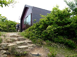 | 野坂岳山頂直下の避難小屋 | 一等三角点のある野坂岳山頂 | 野坂岳山頂から見る岩籠山 |