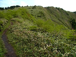 | 山行記 | ●シラネアオイを見たいということで、シラネアオイの群生地で有名な野反湖畔の八間山へ行くことにした。しかし、地図でよく調べると、そこは群馬県の外れで、高速を下りてからの距離が長く、豊川からだと6時間半以上かかる計算になるということなので朝3時の出発とした。 ●天気予報では昼過ぎから晴れるということだが、行く道々ずっと雨が降り続き、時折激しく降る時もある。野反湖が近付いても一向に雨が止む気配がないので、久しぶりのカッパを着ての山行を覚悟したが、野反湖の駐車場に着くと同時に雨が止んだ。一方時間の方は、休憩やコンビニでの買い物を含めても5時間半もかからずに富士見峠の駐車場に着くことができた。 ●早速「シラネアオイ群生地」と大きく書かれた登山口から登り始める。登り始めてすぐにシラネアオイ群生地への分岐が現れるので、まずはそちらを見ていくことにする。平坦な道を進むと樹林の中に入り、シラネアオイの群生地に到着する。時季としてはもう遅いようで、加えて先程までの雨で、綺麗に開いているものはあまりなかったが、まだまだ十分見られる状態だった。 ●お目当てのシラネアオイを楽しんだ後、先程の分岐まで戻り八間山を目指す。このコースは高い木がないので展望がよく、高山植物も豊富だ。振り返れば、草津白根山や横手山、浅間山や榛名山が見え、花は、満開のイワカガミや、咲き始めたばかりのウラジロヨウラクやコケモモ、レンゲツツジなどが気になり、なかなか先へ進むことができない。 ●登るに従い、野反湖や背後の山々がせり上がり、高山植物の種類も増してくる。イカ岩の肩を経てイカ岩の頭に着くと、今までの雨で一旦ぬかるんだ樹林帯を下る。再びササの中に続く登山道を登っていくと山頂の一角に出る。後は、水溜りのできた、タケシマランやツバメオモトが咲く道を緩やかに登れば八間山の山頂に着く。 ●八間山の山頂からは360度の大展望が広がる。天気は、登り始めの肌寒い曇り空から一転青空に広がる天気へと急激に回復し、これまで見えていた赤城山や榛名山、草津白根山、浅間山などに加え、雪の残る岩菅山や、稜線の続く白砂山などをはっきりと見ることができた。 ●気持ちのいい山頂から、今度は池の峠方面へ下る。すぐに白砂山への分岐を分けると、展望のいい往きの道とは違った、樹林の中のぬかるんだ歩きにくい急坂が続く。道沿いにはエンレイソウやコミヤマカタバミ、まだ蕾ばかりだがヒロハユキザサなど、往きとは違った花が見られ新鮮だ。 ●急坂がしだいに緩くなり、車の音が段々大きく聞こえるようになると舗装道路に出るが、ここが池の峠登山口で、駐車場も整備されている。 ●ここから湖畔を歩き車を置いた富士見峠を目指す。木のチップが敷かれた道は気持ちがいい。この辺りはまだ木々の緑が若く、碧い湖面と青空との対比が素晴らしく飽きさせない。途中には500mごとに標識が立てられ、舗装道路沿いにある駐車場とをつなぐ分岐もある。 ●最後の木の階段を登ると、富士見峠の休憩舎に着く。朝とは違い多くの観光客や登山者で賑やかだ。車を停めた第一駐車場にはバスが3台も停まっていた。 |