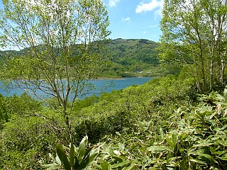 | 池の峠登山口 | 湖畔の遊歩道では緑が眩しい | 湖畔の遊歩道から見る八間山 |