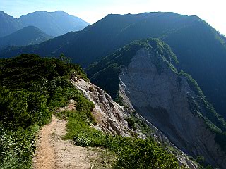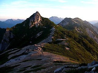 | 山行記 | 一日目 ●アルプスもこれまでいろいろ登ってきたが、それぞれ単独で登ってきたものが多く、そろそろ稜線を繋ぐ山行をしてみたくなってきた。ということで、思いついたのが北アルプスの中でも最も標高の低い稜線で、おそらく最も地味なこのコース、しかも、崩壊が激しくなかなかの難コースらしい。 ●梓川SAで仮眠し、駐車場のある七倉へ向かう。少し早く出過ぎたのか、5時前に七倉の駐車場に着いた。ゲートの開くのは5時半、まだ高瀬ダムへ行くタクシーも来ていなかった。やがて、タクシーが来ると相乗りで乗車し、登山口の高瀬ダムまで向かった。 ●高瀬ダムに着くと、靴の紐を縛り直して出発する。トンネルを歩いてブナ立尾根の取り付きまで河原を歩く。ここを歩くのは3度だが、来る度に道が違うように感じる。 ●ブナ立尾根の取付からは、いきなり桟道のかかる急登が始まる。日本三大急登に数えられるこの尾根は、急だが道がジグザグに付けられている上によく整備されているので意外と登りやすい。 ●しかし、これといった目印もなく登り続けるのは大変だ。明日以降の長い行程を考え、焦らず抑えながら登ると三角点を見つけた。これが地図上の2208.5mの三角点で、コースタイムと比べると大幅に早いペースということになる。 ●三角点を過ぎると傾斜は一旦緩み、烏帽子岳や、明日歩くであろう崩壊の進む荒々しい稜線が見えてくる。再び急な道を登り詰めると小さな広場に出るが、そのすぐ下が稜線分岐で、そこからはもうこの日宿泊する烏帽子小屋も見える。 ●10時前に烏帽子小屋に着いてしまったが、ここから次の船窪小屋まで行くのは無理なので、予定どおりここに宿泊することにして、何とか時間を潰すことにした。 二日目 ●朝食は5時からということなので、弁当を頼んでおいて5時前に出発する。日の出時刻前なので、どこかで御来光を見ることができるだろうと思って歩いていると、丁度ニセ烏帽子の辺りで見ることができそうなので、そこまで行って御来光を待つ。 ●低い所に雲があったので、実際の日の出時刻より少し遅れて太陽が昇った。振り向けば赤牛岳の上に残月が、薬師岳や立山連峰が少しずつ赤みを帯びていく。 ●しばらく山並を眺めた後先へ進むと、すぐに烏帽子岳への分岐に着く。せっかくなので烏帽子岳にも登っていこうと荷物を置いてそちらへ向かうと、6羽の子を連れた雷鳥がとおせんぼ。雷鳥を刺激して親子がはぐれないようにゆっくりと進んだ。 ●烏帽子岳の頂上を後にして、いよいよ未踏の道に踏み入る。南沢岳へ向かう途中は、四十八池と呼ばれる地塘が点在する湿地帯で、花も豊富だ。 ●四十八池を過ぎると南沢岳への登りが始まる。最後、コマクサが一面に咲く岩礫地を登れば南沢岳山頂だ。山頂からは薬師岳が正面に対峙し、裏銀座など北アルプスの主要な峰々が見渡せる360度の大展望だ。 ●南沢岳の下りからこのコースの特徴である、崩壊地の縁上を歩く不安定な道が始まる。崩壊地の縁上の道は、所々崩れ、反対側の樹林の中に代替の真新しい道が付けられている。その中には、ハイマツが切られておらず歩き難い所も何箇所かあったが、台風で荒れた直後で、まだ整備中とのことだった。 ●険しい道が続くが、この辺りは高山植物が豊富で、次々といろいろな植物が現れ飽きさせない。しかし、油断をして花に見とれていると足を踏み外すので要注意だ。 ●南沢乗越を越えると不動岳への登りにかかるが、これまでの切れ落ちた道が急になるので余計に大変だ。偽ピークを過ぎ、やはりこの山も頂上直下はコマクサの咲く岩礫地帯だ。不動岳山頂の標柱は、最高点をやや下がったところに設置されている。 ●ここまで来ると、今日の目的地の船窪小屋がぐっと近くなるが、まだまだ道のりは険しく長そうだ。その向こうには蓮華岳が遠くにどっしりと聳えている。 ●暑さのせいか、ペースが落ち気味だが、樹林帯を登って船窪岳第二ピークに到着する。第二ピークがあるなら第一ピークはどこかと思いながらアップダウンの多い道を進むと、第二ピークよりははるかに低いピークに船窪岳山頂の標柱が立っていた。 ●船窪岳山頂から下ると、この日の最後の登りである七倉岳への登りとなる。崩壊地の縁を登るとキャンプ場に到着し、船窪小屋へは、そこからさらに歩く。ここまで来て大分バテ気味で、コースタイムからは遥かに遅れて小屋まで辿り着いた。 三日目 ●最終日は、最も長い時間歩く予定なので、4時過ぎには小屋を出て、七倉岳で御来光を拝む。この日は前日より更に天気がよく、蓮華岳以北の後立山連峰を除く北アルプスの山々、八ヶ岳や富士山まで見ることができ、なかなか立ち去り難い所だが、まだまだこの日の行程は長いので先を急ぐ。 ●七倉岳より先は、ここまでのように崩壊地の縁を歩くようなことはないが、不安定な下りが続く。鞍部となる七倉乗越からは、北葛岳への登りとなる。 ●北葛岳は、