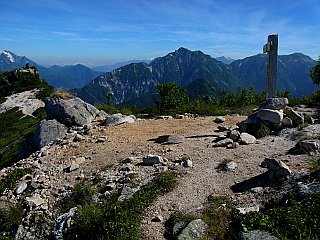 | 船窪岳第二ピーク | 高瀬湖の奥には槍ヶ岳が見える | 船窪岳山頂 |