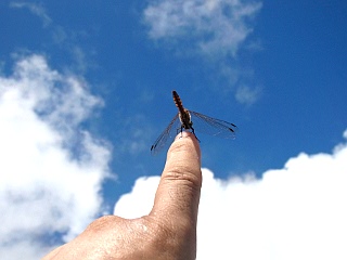 | 物見山山頂から見る牧場方面 | 物見山山頂から見る牛伏山保面を振り返る | 指先にとまった赤とんぼ |