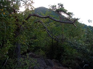 | 山行記 | ●平日の休みで、竜王のアウトレットパークへ行くことになったが、せっかくなので、早く出て三上山に登ることにした。近江平野に円錐形の美しい姿を見せるこの山は、近江富士とも呼ばれ、一度は登ってみたいと思っていた山の一つだった。 ●トイレも整備された御上神社の駐車場に車を停め、車が頻繁に往来する国道8号線を横断し、登山口へ向かう。国道を渡れば、交通量の少ない道になりほっとする。 ●裏登山道への入口のすぐ先が表登山道の入り口で、急な階段を登り、動物除けの柵を空けて、さらに続く急な石段を登る。石段は妙見堂跡まで続く。広場となった妙見堂跡には常夜灯があり、ヒヨドリバナが咲いていた。 ●さらに登ると、二越まで20mという案内があるので、それに従って行くと、展望が開け、近江平野や琵琶湖、少し雲がかかっているが比叡山、振り返ればこれから向かう三上山の姿を見ることができた。 ●分岐まで戻り、登って行くと、割岩への分岐に出る。割岩は鎖を使って登り、岩の間を通ることになるが、メタボ体型の者にはなかなか厳しく、ザックを手に持ち、ウエストポーチをずらしてやっとのことで抜けることができた。 ●割岩は、そのままその先の登山道に戻ることができ、そこからの道は、大岩の上に固定された金属の手摺を伝いながら登ることになる。展望がいいので、度々止まっては景色を眺める。 ●やがて展望台という所に着く。そこには展望案内板があるので、それを見ながら存分に展望を楽しんだ。それでは、そろそろ進もうと上を見上げると、既にそこは山頂の一画で、山頂の鳥居が見えた。 ●三上山山頂には、祠が祀られ、先に来ていた登山者がお参りをしていた。山頂自体は狭く、何もないので、今度は裏登山道を通って下山することにした。 ●一旦下ると、苔が谷と案内のある鞍部に出る。再び登り双耳峰のもう一つのピークを過ぎると、本格的な下りが始まる。裏登山道は、表登山道と比べるとなだらかだということだが、やはり円錐形の山はどこを下りても急だ。しかも、苔の生えた一枚岩の上を下りるところもあり、なかなか大変だ。 ●表登山道へと続く中段の道を横切ると、女山の谷と呼ばれる谷沿いを下る。やがて、表登山道への連絡路を分けると、動物除けの柵が現れ、それを越えると舗装された駐車場がある広場に出る。 ●後は、舗装道を歩いて御上神社駐車場まで戻る。この山は入山料が必要だが、朝早過ぎて納めることができなかったので、御上神社を見ながら社務所へ行くことにした。御上神社は由緒のある神社のようで、国宝、重文クラスの建物がずらりと並んでいた。 |