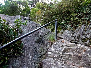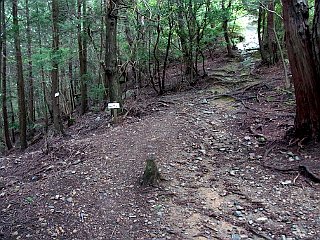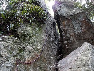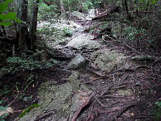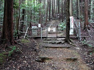 | 苔の生えた滑りやすい一枚岩 | 中段の道と交わる打越 | 裏登山道入口の動物除けの柵 |