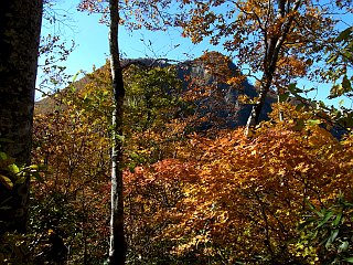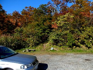 | 湯峠駐車場の一画にある登山口 | 登り始めるとすぐ背後に雨飾山が現れる | 紅葉の向こうに大渚山東峰 |