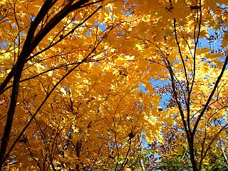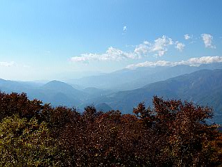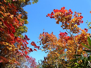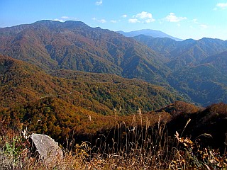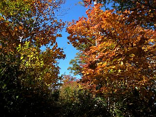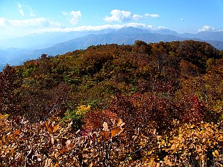 | 山行記 | ●前日に行った鍋倉山の紅葉はあと一歩という感じで、少しがっかりさせられたが、この日訪れる大渚山は、鍋倉山より標高も少し高いので、紅葉も期待できそうだ。 ●小谷温泉から車で山道を上って行くと、紅葉は徐々に鮮やかさを増し、紅葉の名所である鎌池へ向かう道では、朝にもかかわらず駐車場へ入る車の行列ができていた。 ●湯峠に向かう道では、所々で車を停めて三脚を構える人達がいた。既に数台の車が停まっている湯峠の駐車場の周囲はまさに紅葉真っ盛りで、青空と紅葉で眩しいぐらいだった。 ●駐車場に車を停めると、早速駐車場の一画にある登山口から登り始める。登り始めてすぐ紅葉の木々の背後に雨飾山が見えてくる。以降は、度々立ち止まっては、朝の日差しを透過する美しい紅葉と紅葉の絨毯の背後に聳える雨飾山の雄姿に見とれているのでなかなか歩が進まない。 ●地図上の1,365mのピークを過ぎると道は一旦下り、急な登りが始まる。1時間余りで登ることのできる山なのでその登りもそれ程ではないが、逆に大したことはないと思っているので意外に応えた。 ●急な登りを登りきると少し傾斜が緩くなり、東峰と西峰の分岐が現れる。東峰は、そこから急坂を少し登ったところにある。東峰は狭いが360度の展望が開け、今まで見えていた雨飾山はもちろん、金山や黒姫山、妙高山、高妻山、戸隠連峰、そして糸魚川市街や日本海まで見ることができた。 ●大渚山は東峰と西峰からなる。せっかくなので西峰にも寄って行くことにして、分岐からそちらへ向かう。西峰への道は平坦だがぬかるみが多く歩き難い。ぬかるみに難渋しながら歩いていると木の展望台兼避難小屋が現れ、その手前に山名の標柱が立てられていた。 ●下からでは展望がないので展望台に登ってみる。最後の一段が抜けて登り難い展望台からは、特に北アルプス方面への展望が開け、雲のかかった白馬岳から五竜岳までは見ることができなかったが、雪倉岳や朝日岳、そして霞んではいたが鹿島槍ヶ岳や槍ヶ岳も確認することができた。 ●青空と紅葉と展望をしばらく楽しんだ後、下山にかかる。駐車場からの帰路、多くの人が三脚を立て紅葉をカメラに収めていた。鎌池は、混んでいなければ寄って行こうと思っていたが、相変わらず車の列が続いていたので寄らず、雨飾荘で温泉に入り、帰路についた。 |