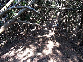 | 山行記 | ●登山口の大山トンネル北口は、草が生い茂り、車を止めるのもためらう程だ。登山口も草茫々で、茨やひっつき虫が気になるが、とにかく踏み入ってみる。 ●しかし、一度踏み入ってしまえば植林帯の道で、草も気にならないいつもの歩きやすい道になった。なだらかな道は、沢筋の道となり、沢を詰めて尾根道に出る。 ●尾根道は雑木の明るくて気持ちのいい道で、臍岩への分岐やトンネル南口からの合流点を経てしだいに傾斜を増す。途中にある梔子岩からは雨乞山方面や田原アルプスを展望することができた。 ●傾斜がやや緩やかになると、自衛隊豊川駐屯地と書かれた国有地の広場に出る。ここから山頂にかけては明るく日当たりがいいので花が豊富だ。 ●既にここは山頂の一画で、電波塔のある広場を過ぎるとすぐに越戸からの道と合流し、そのまま進めば、電波塔が林立する越戸大山山頂だ。山頂には衣笠山と同じ展望台があり360度の展望が広がるが、電波塔や電線が邪魔をして今一つだ。帰りは、来た道を戻った。 |