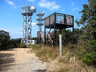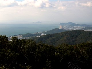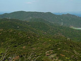 | 越戸方面からの道と合流する | 展望台と電波塔が林立する越戸大山山頂 | 越戸大山山頂から見る海岸線と神島 |
